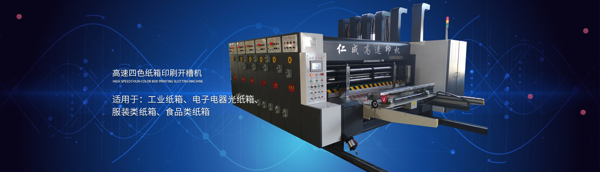 主要產(chǎn)品: 紙箱印刷開槽機(jī), 高速印刷開槽模切機(jī),自動插格機(jī),釘箱機(jī),粘箱機(jī),仁成包裝機(jī)械,紙箱機(jī)械